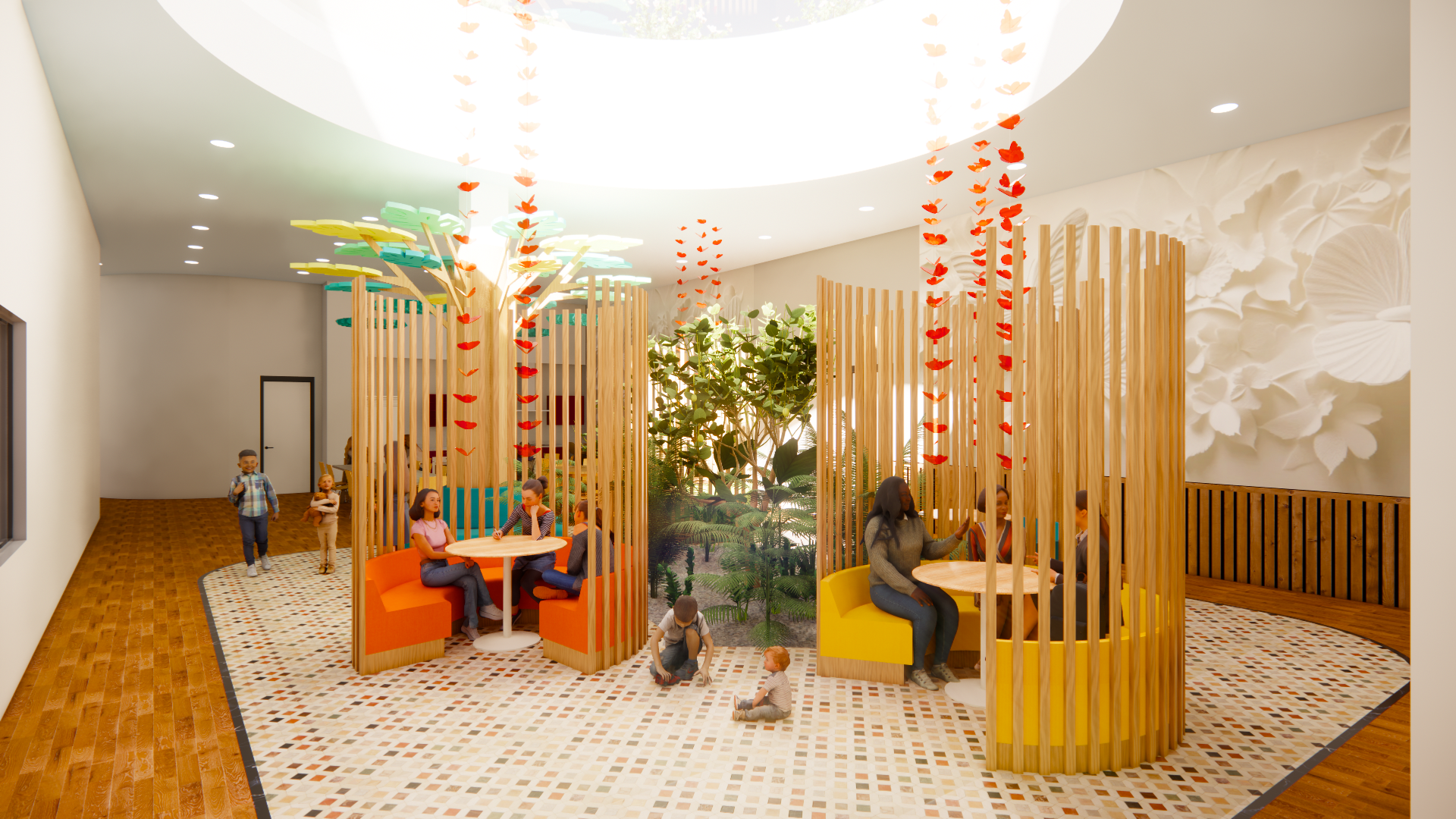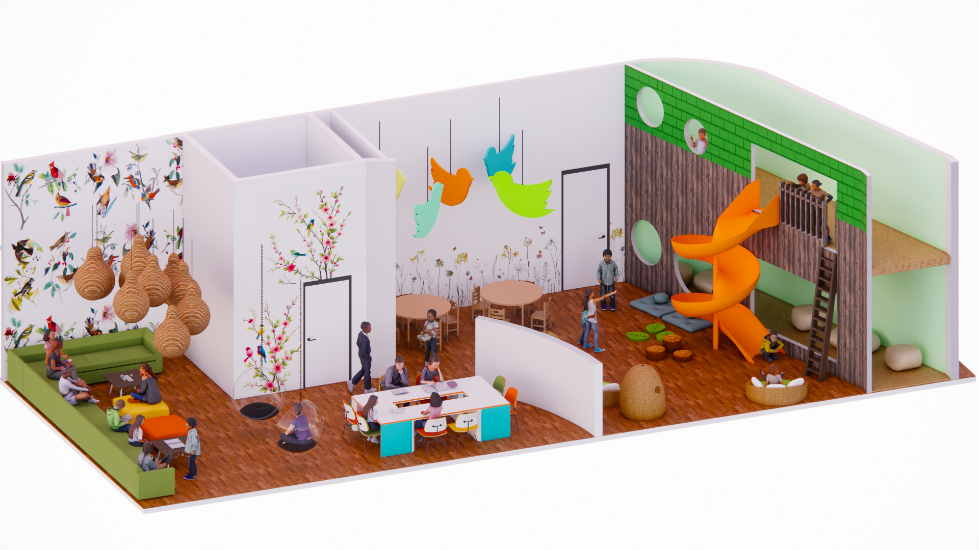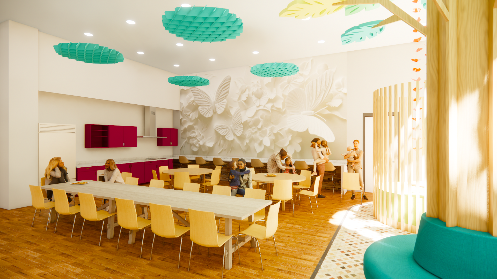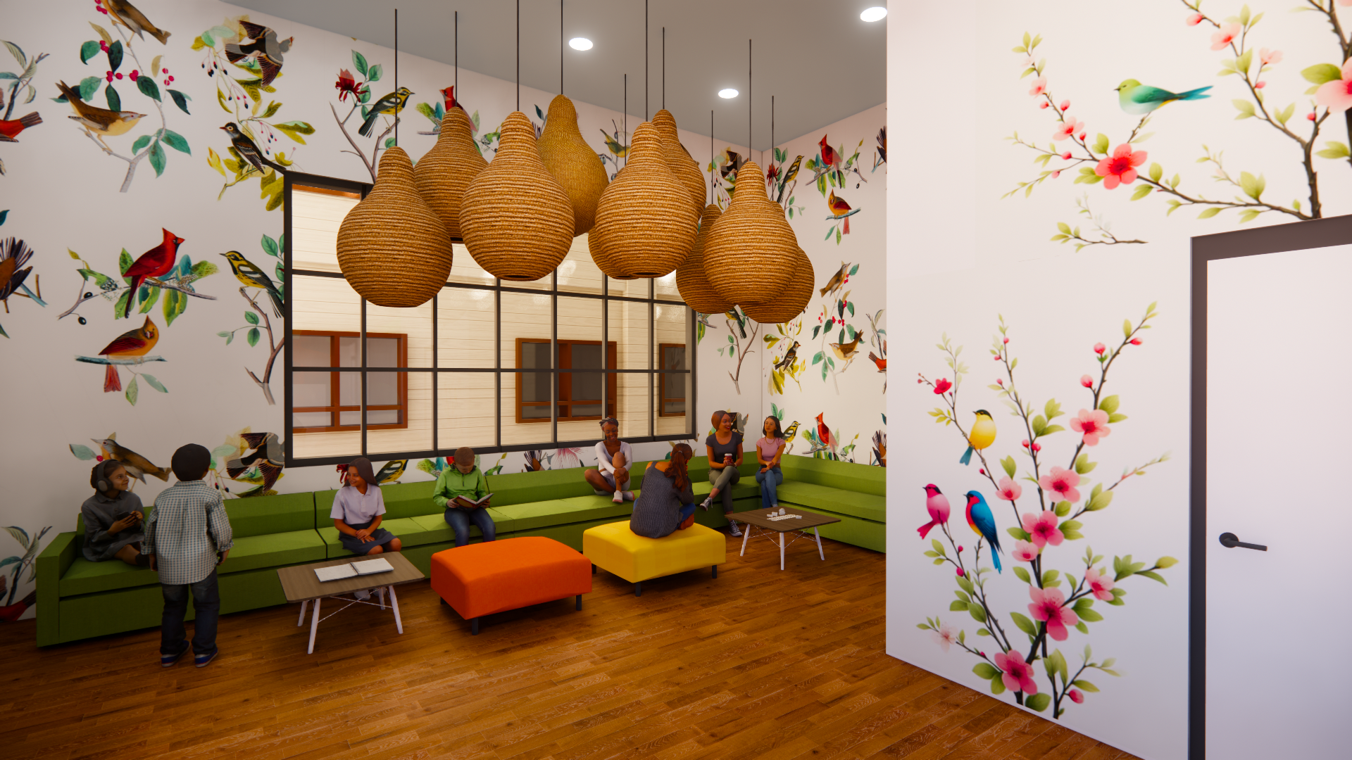 Designed around the architectural concept of "Fly Away" the community center serves as a transformative environment for mothers and children. The facility consists of a central communal hub flanked by two residential buildings designed as "treehouses," creating a symbolic and literal elevation from past circumstances. This center integrates comprehensive support services, including a vocational business center with a library and a boutique thrift shop for professional preparation. Mental health is prioritized through dedicated therapeutic suites, a quiet room, and a clinical exam room, complemented by a specialized daycare for children under four.