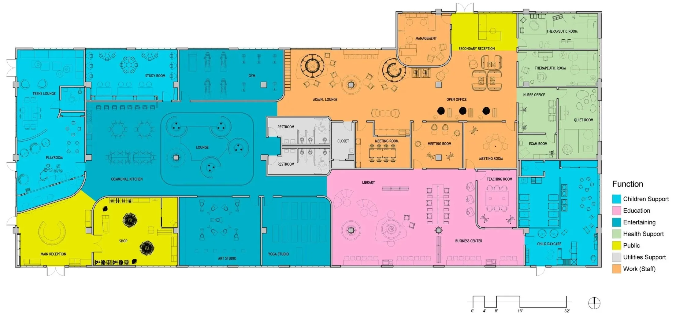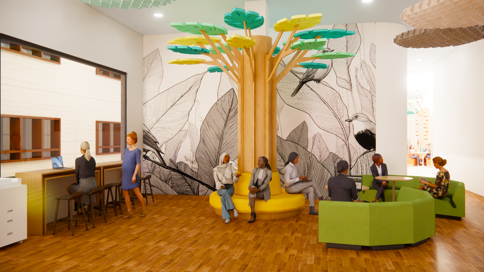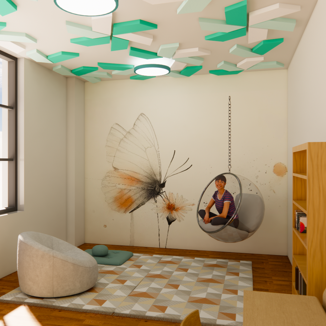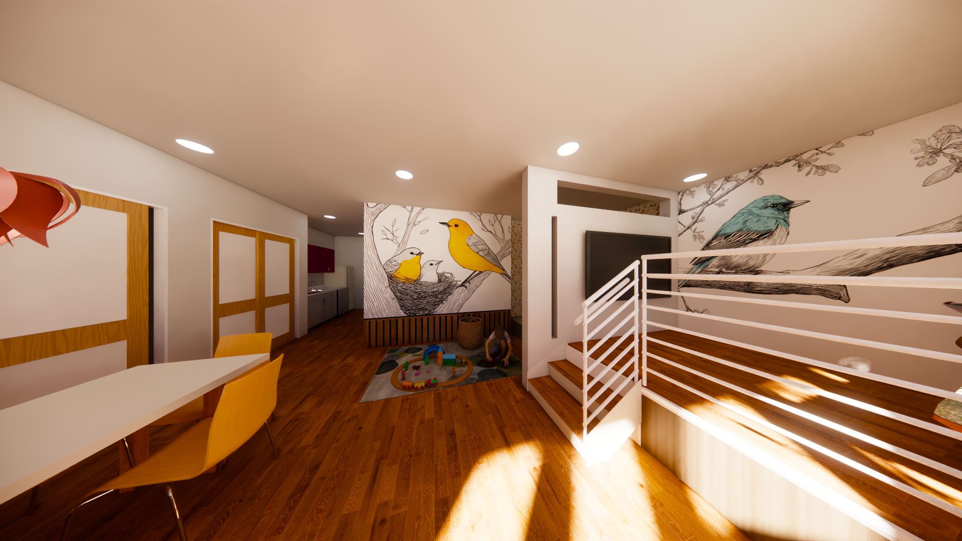 Designed around the architectural concept of "Fly Away" the community center serves as a transformative environment for mothers and children. The facility consists of a central communal hub flanked by two residential buildings designed as "treehouses," creating a symbolic and literal elevation from past circumstances. This center integrates comprehensive support services, including a vocational business center with a library and a boutique thrift shop for professional preparation. Mental health is prioritized through dedicated therapeutic suites, a quiet room, and a clinical exam room, complemented by a specialized daycare for children under four.