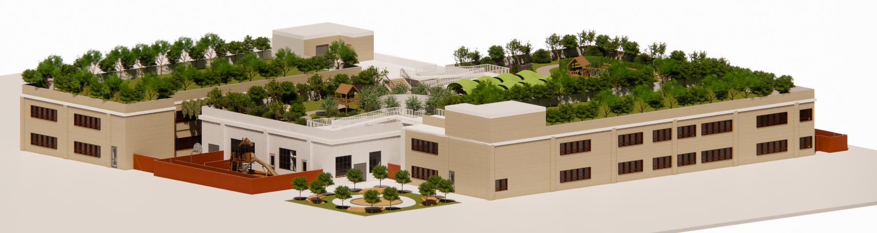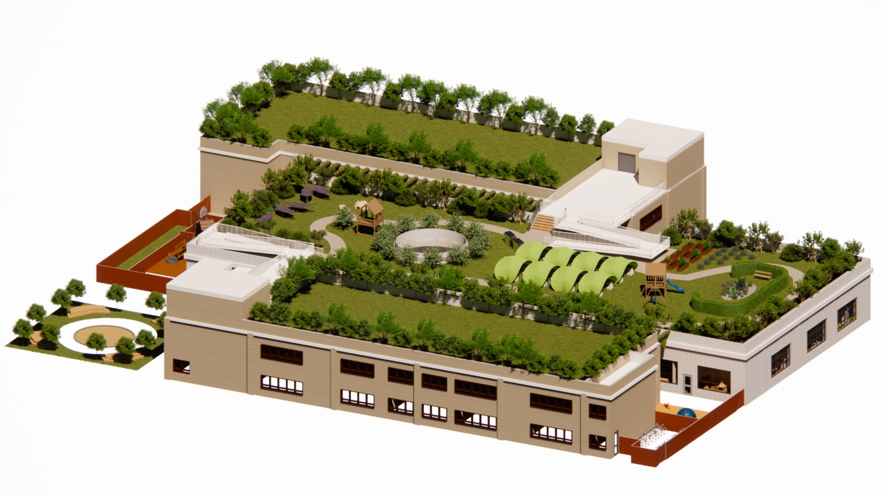The structures are united by an emphasis on nature, featuring vegetated roofs across the campus. The roof of the community center acts as a restorative landscape, offering a meditation garden, a playground, a vegetable garden, and a lavender plantation, providing a dedicated space for families to gather, eat, and heal.